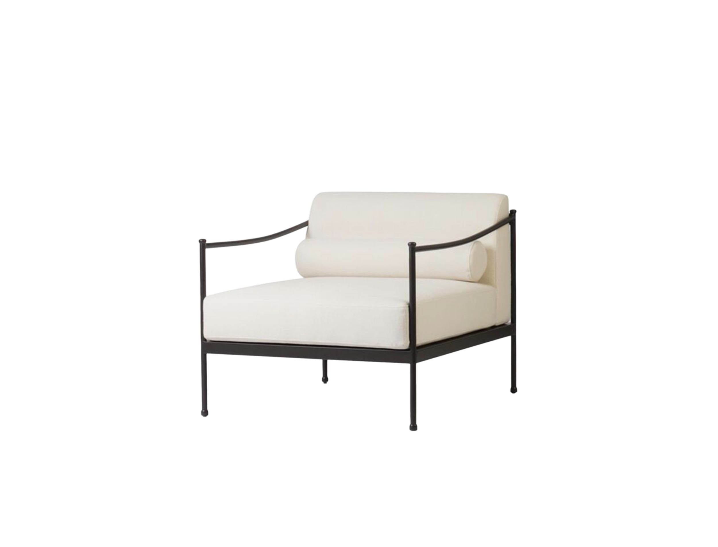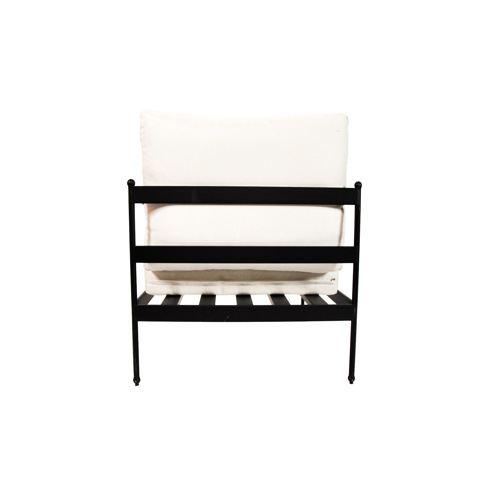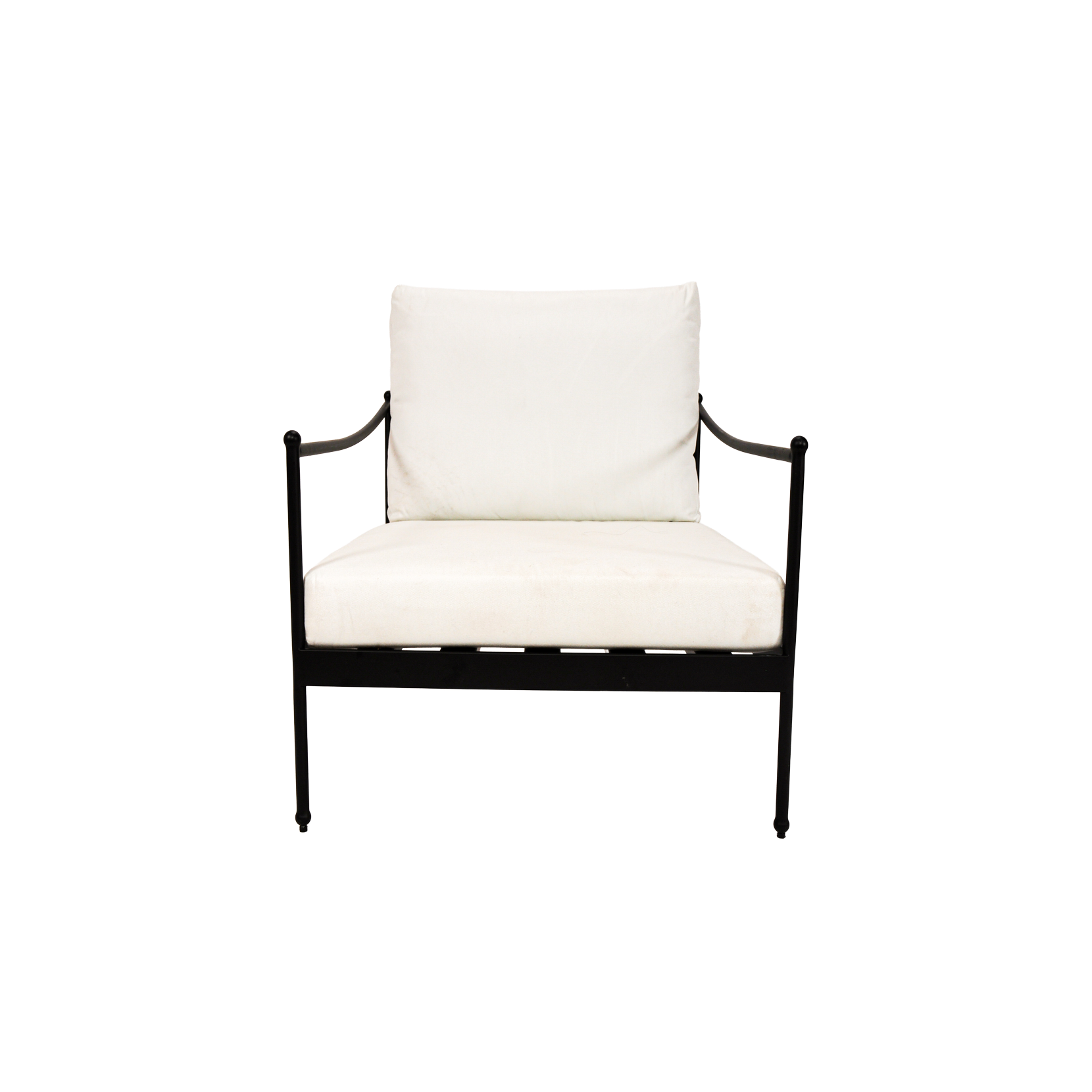 Black rod iron frame chair with white linen outdoor fabric cushions
