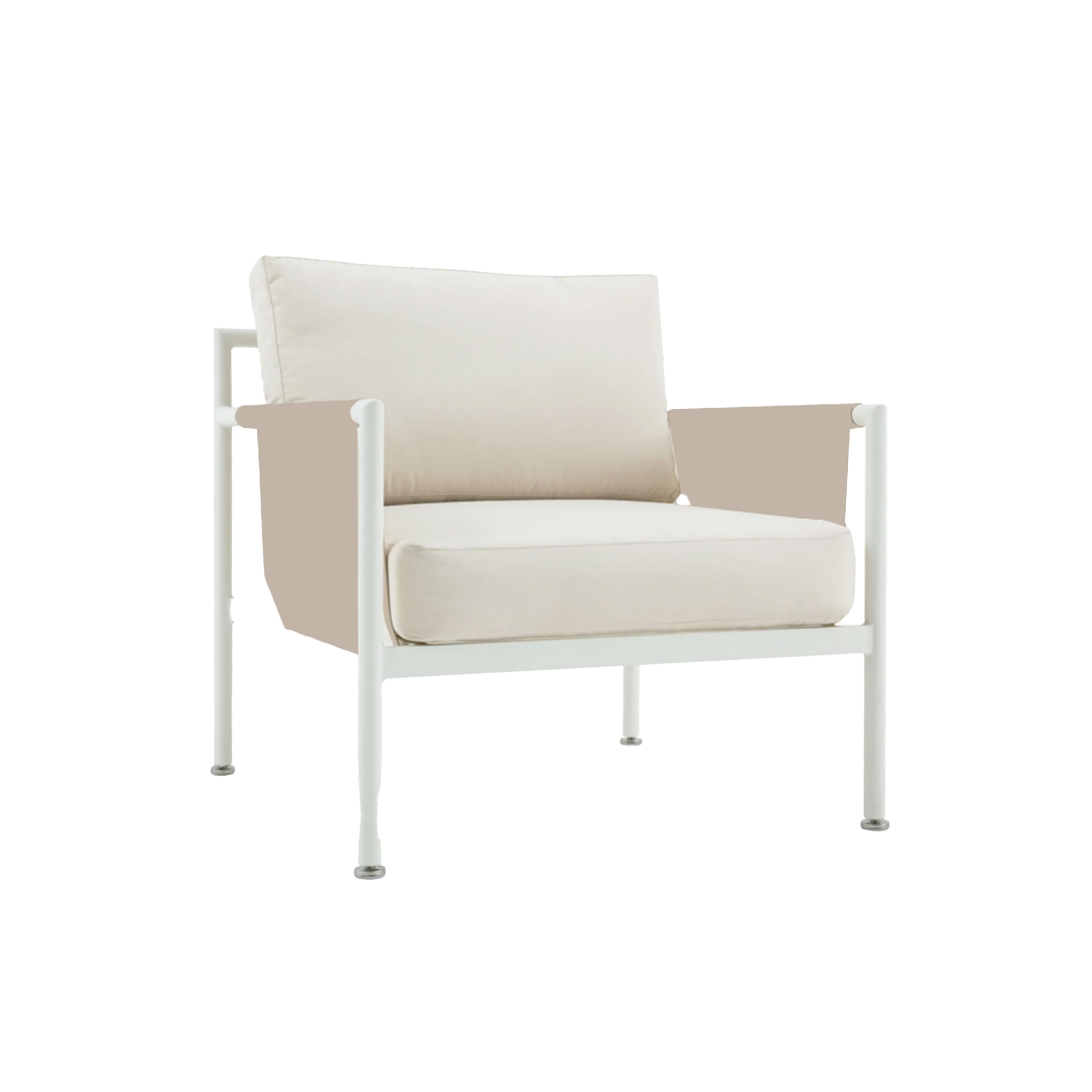 Outdoor white metal frame accent chair with beige accents and white linen cushions