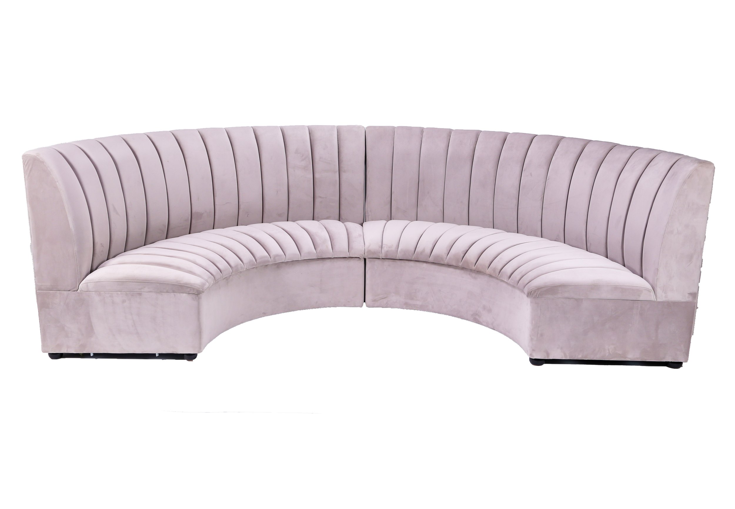 Steel grey velvet half circle banquette available as one single piece to seat 3 people or 2 pieces to seat 5-6.