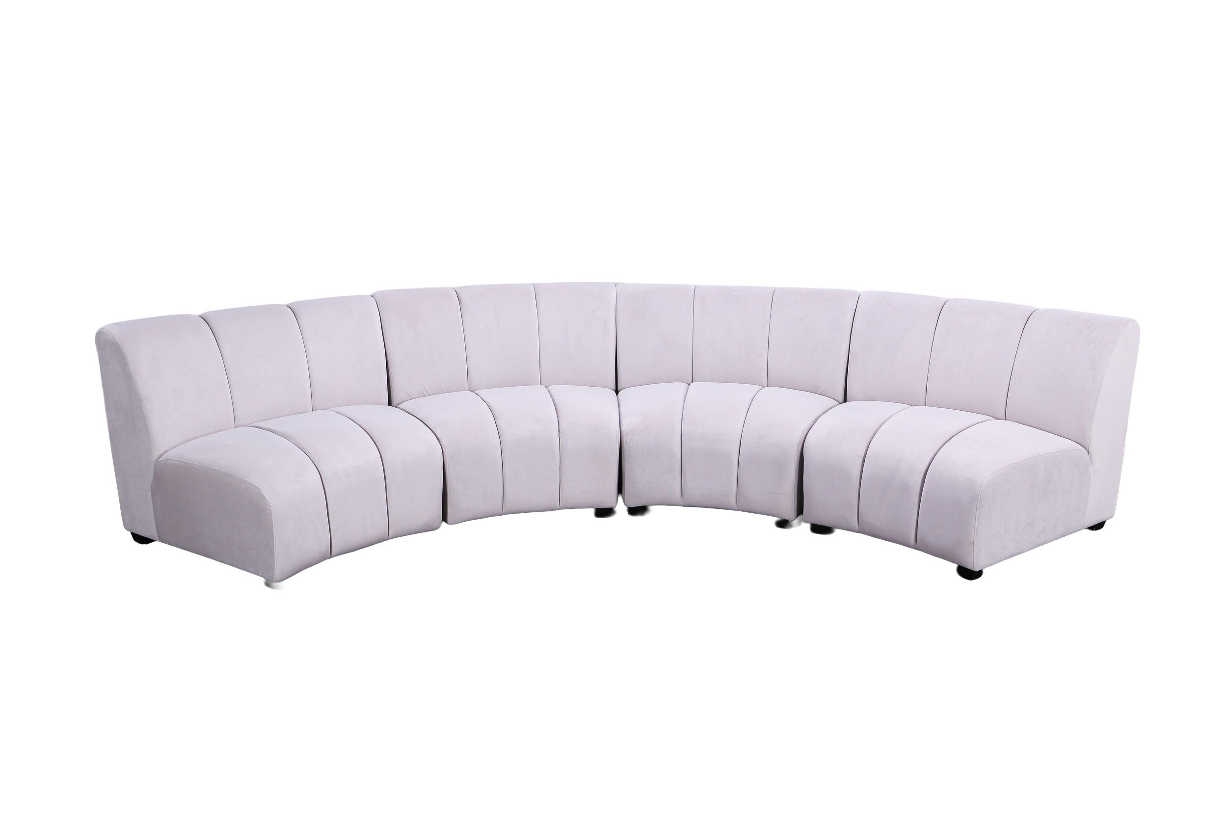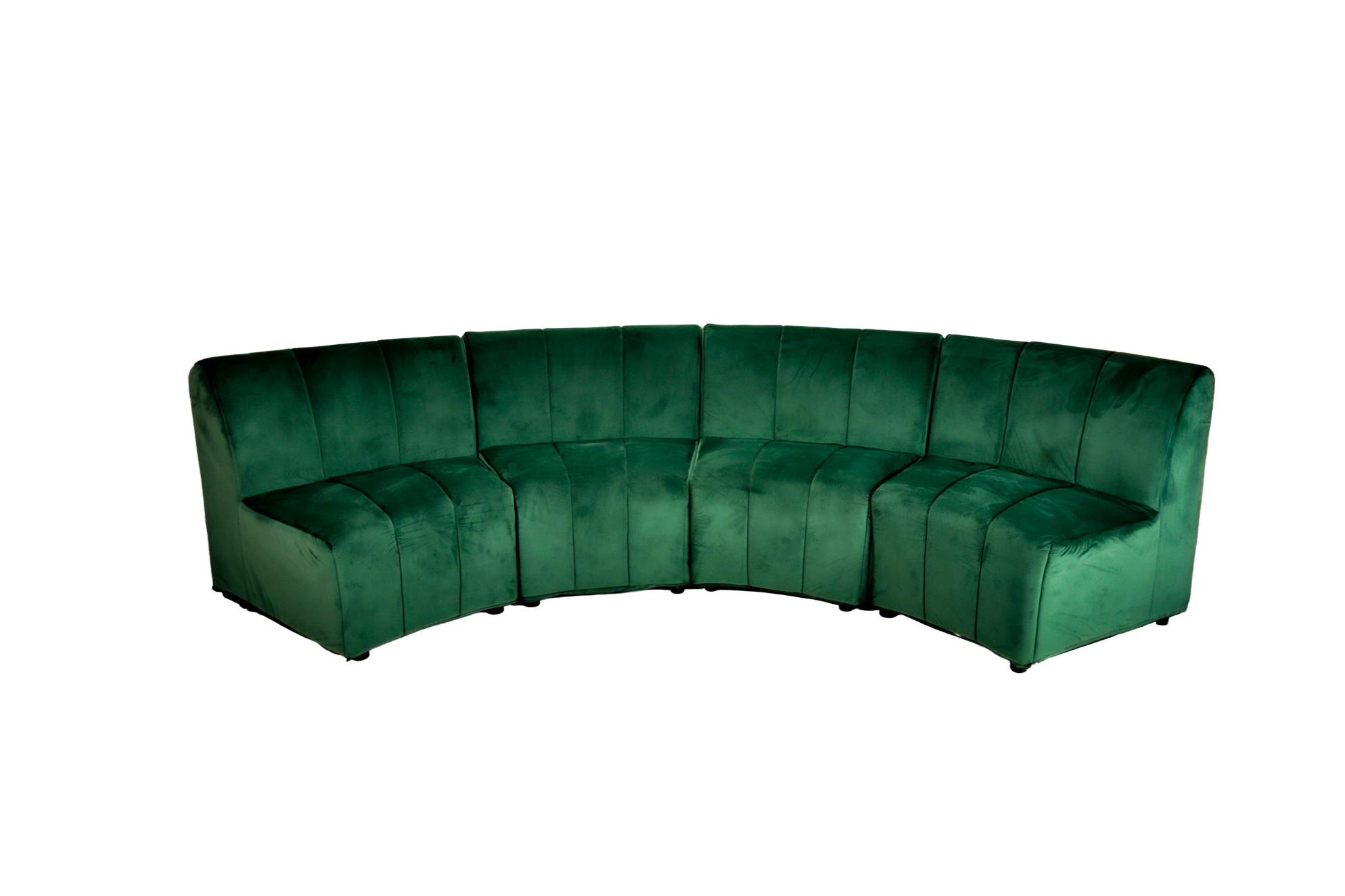 Sectioned curved banquette with low back & tuffed velvet covers available in four beautiful colors.