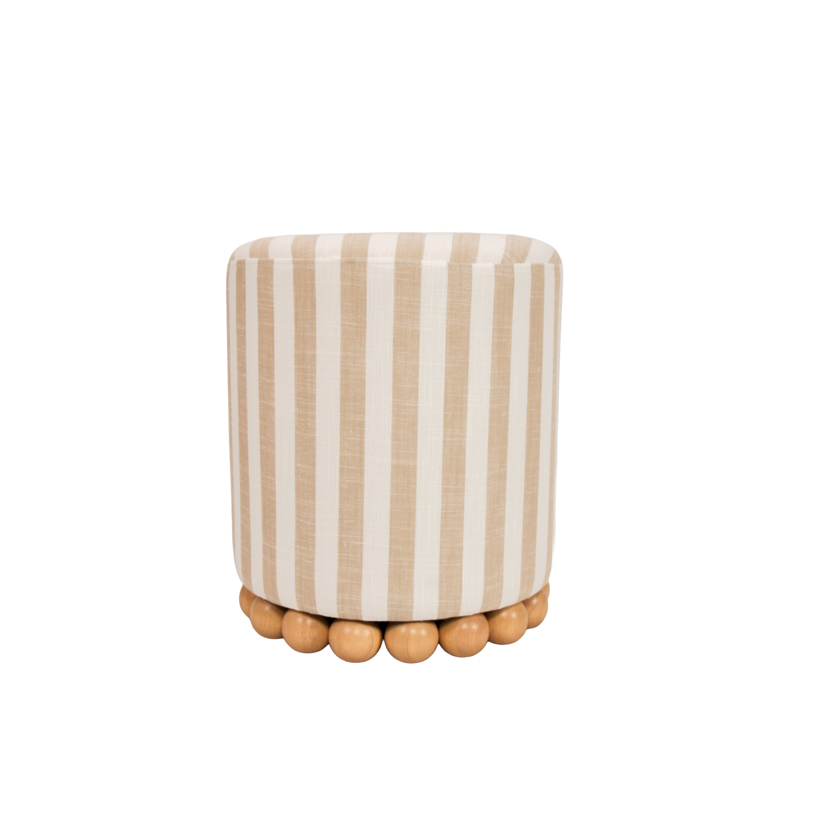 View fullsize The Montauk Round linen striped ottoman with round wood feet at baseQTY: 4 H: 18.3in x W: 15.7in x L: 15.7in Request a Quote