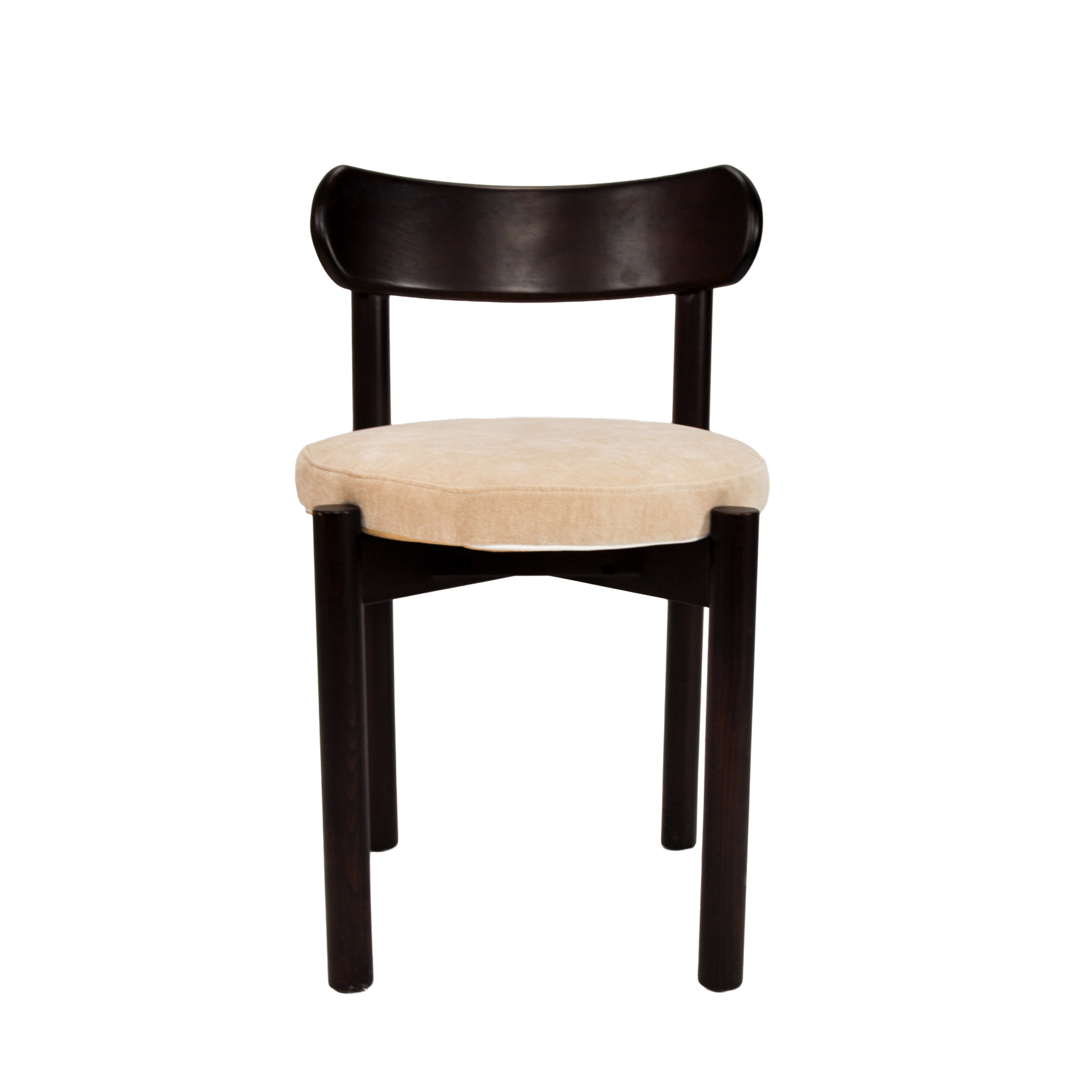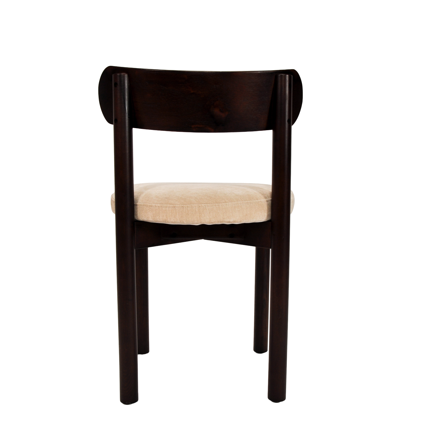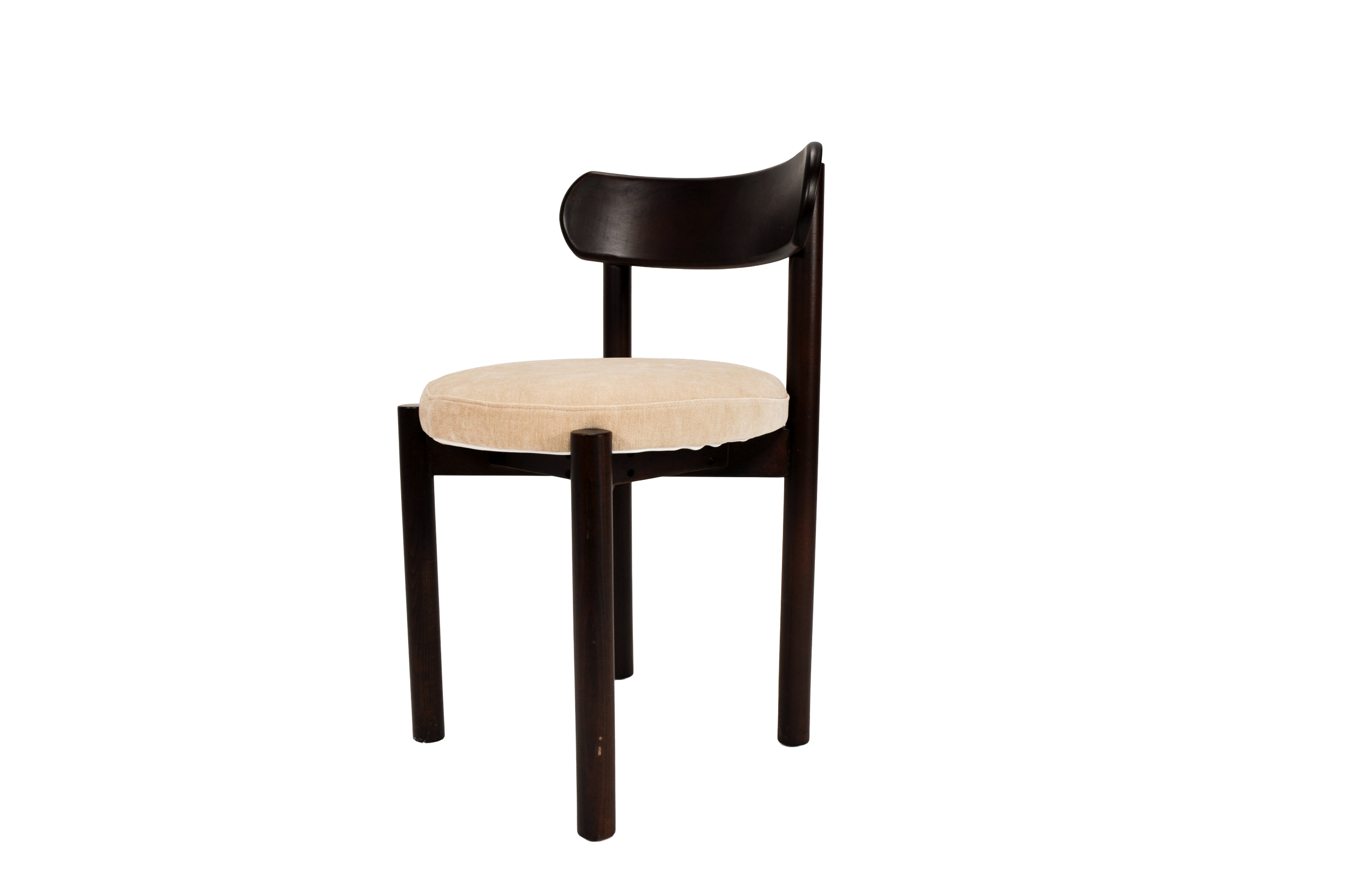 Dark Walnut wood frame chairs with curved features and champagne round cushion