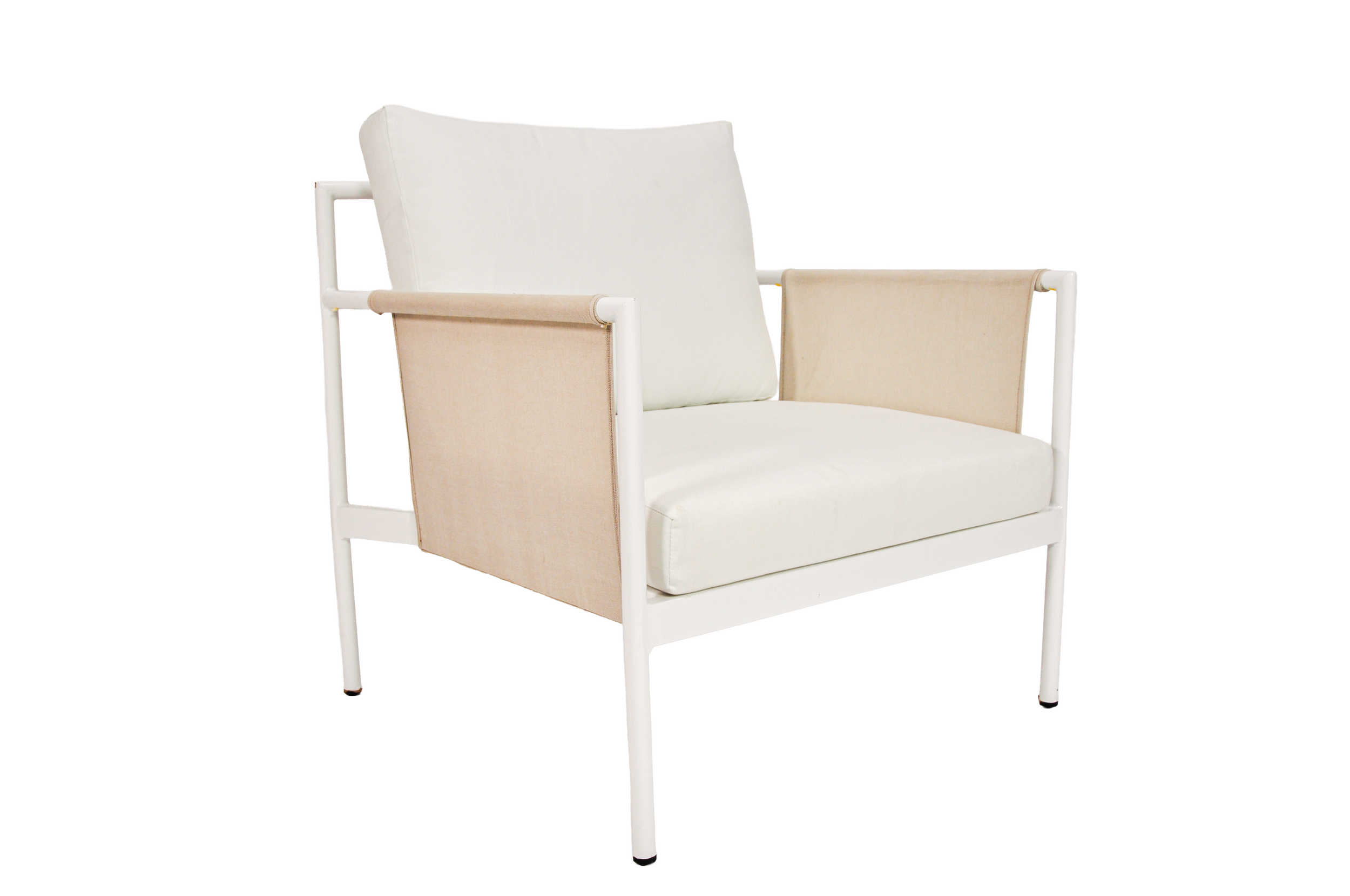 View fullsize The Hampton White metal outdoor sofa with beige fabric QTY: 4 H: 42in x W: 29in x L: 94.5inMatches the Key Largo Accent Chair Request a Quote
