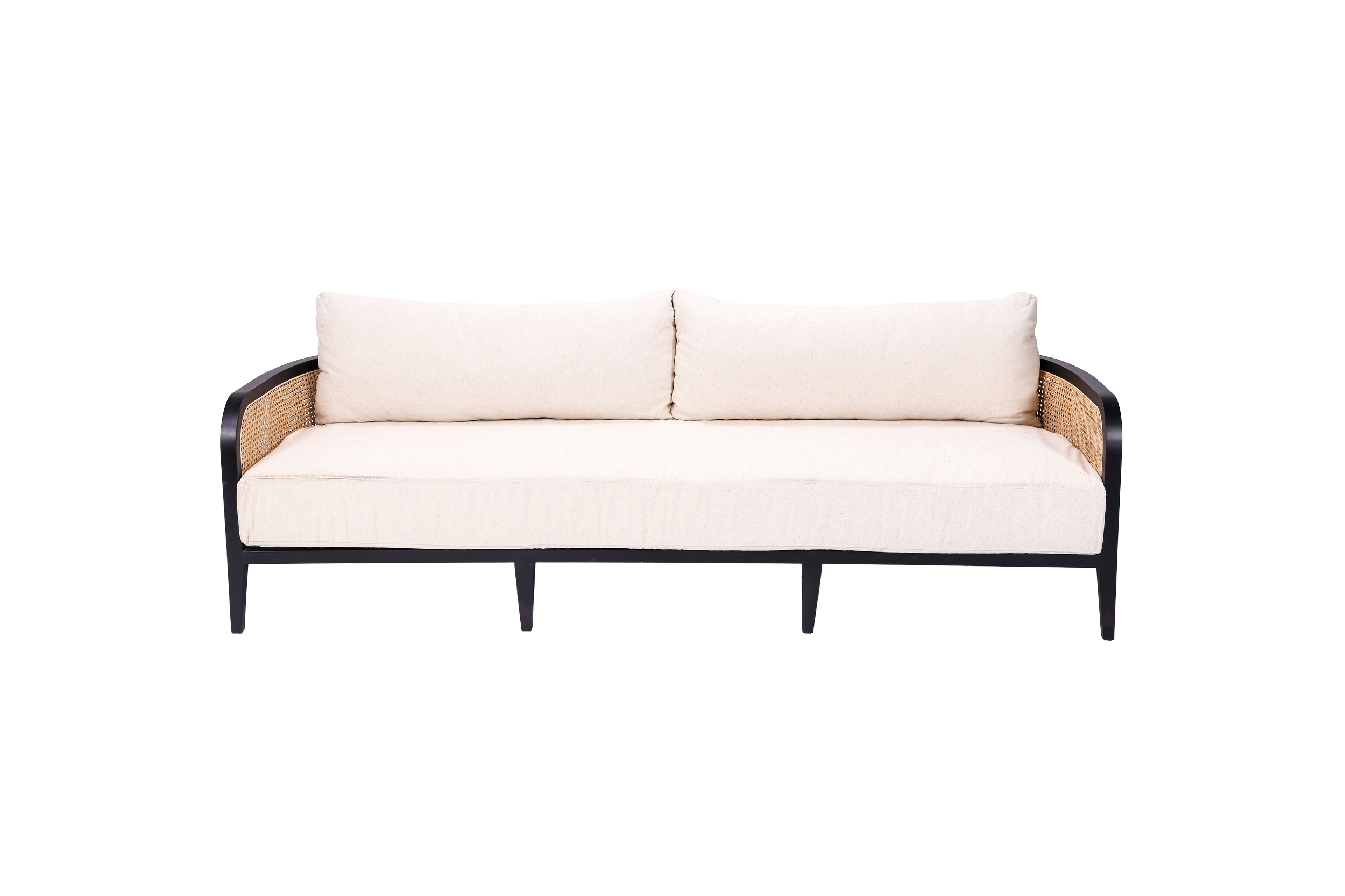 Black wood frame sofa with natural rattan and oatmeal linen cushions